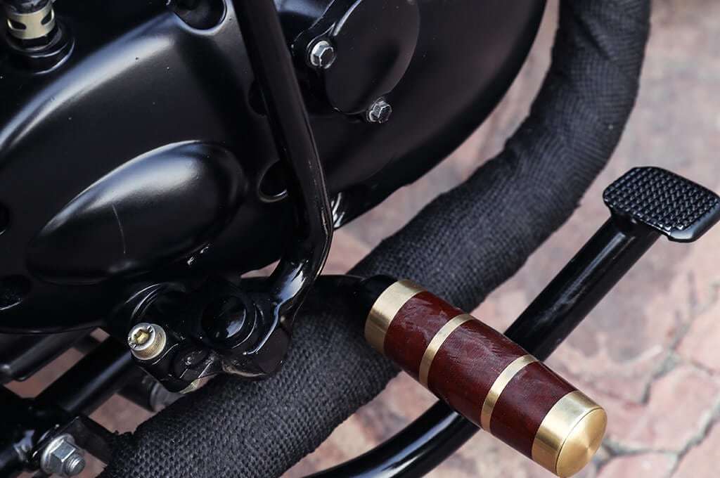 • Custom Brass Detailing: This is where the motorcycle truly shines. Hand-finished Custom Brass detailing is integrated throughout the build, including the elegant RCM shield badge on the tank, the circular accent next to the battery cover, and the machined caps on the front springer and foot controls. The blend of raw brass against the black canvas provides a stunning contrast.