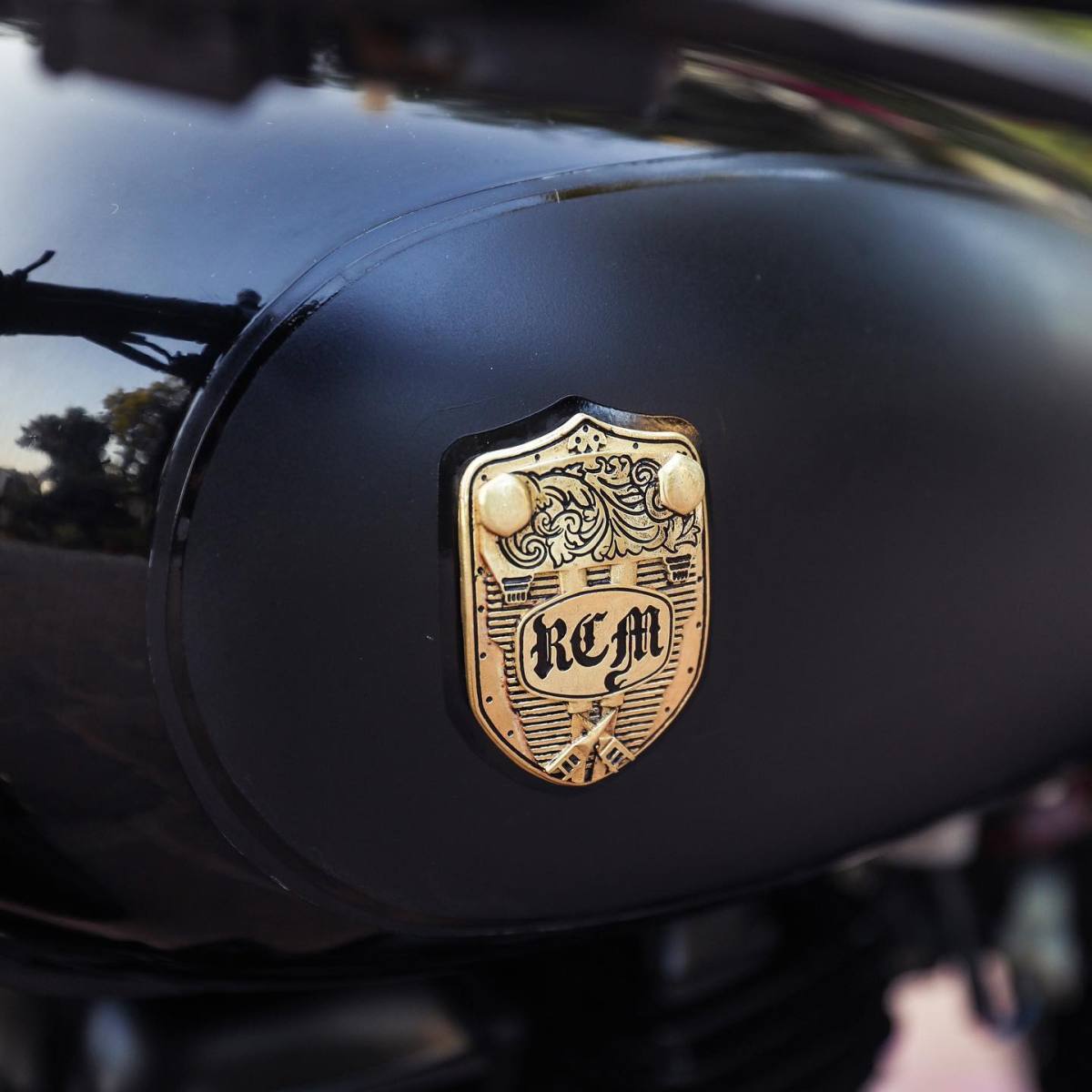 • Custom Brass Detailing: This is where the motorcycle truly shines. Hand-finished Custom Brass detailing is integrated throughout the build, including the elegant RCM shield badge on the tank, the circular accent next to the battery cover, and the machined caps on the front springer and foot controls. The blend of raw brass against the black canvas provides a stunning contrast.